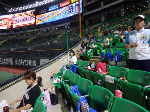 | 試合前の練習風景 | 内野自由席、最前列を確保しました。ネットがあるため安心 | |