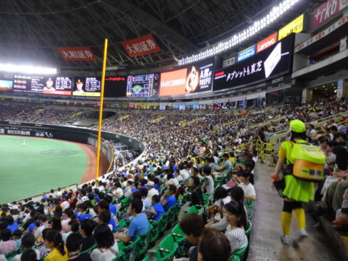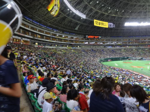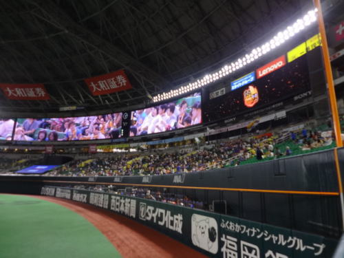 | 内野席よりホーム側を眺めたもの。ぎっしり超満員 | 内野席より1塁側外野方面を眺めたもの。この日は11対3でホークスの勝ち |