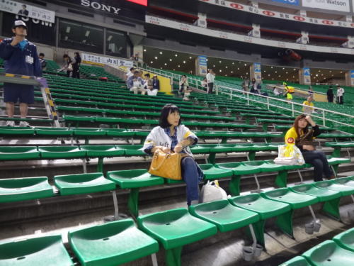| 外野席で楽天の練習を見学中 | 外野席で楽天の練習を見学中 | |