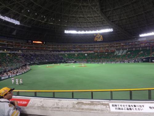 | 試合前の練習を見学 | 練習ではスタンドにたくさん球が飛び込んでスリルいっぱいでした。 | |