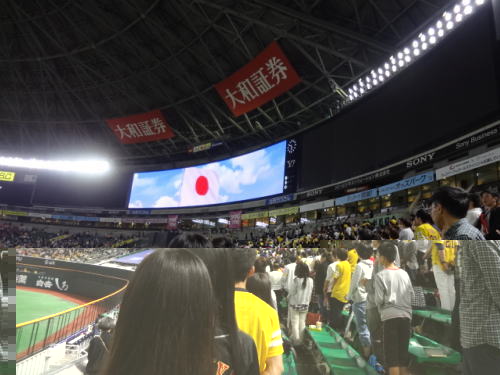 | 試合前の外野席風景 | 試合開始前の国旗掲揚 | |