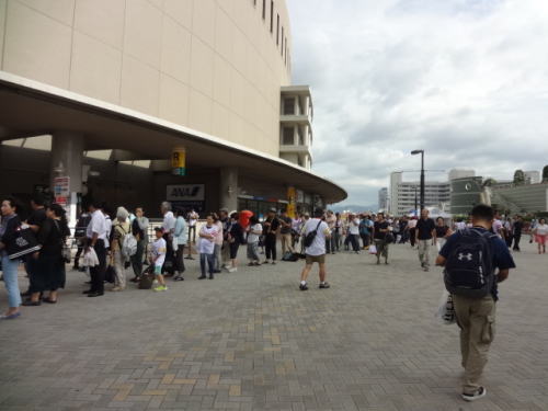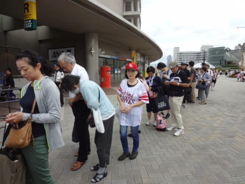 | 会員専用の練習見学に入場するため並んでいる | 入場開始30分ほど前、150人ほど長い行列ができている | |