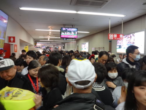 | 通路にはバイキングの品を受け取るためにたくさんの人がいましたが、 観覧席もたくさんの人で埋まっています |