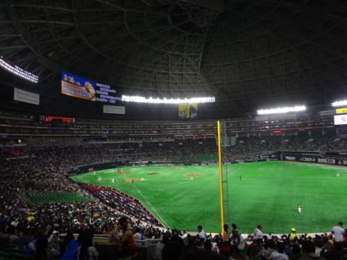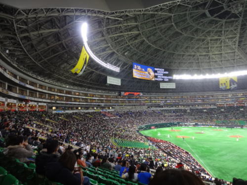 | 一塁内野後方から感染しました。本日は全席自由でしたがバイキングを優先 | 座席に座ったのが5回の攻撃付近から、それまではバイキングに夢中 | |