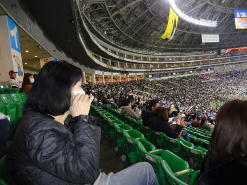 | 本日は2018年球春の始まりとして初のオープン戦である。相手は阪神タイガース。Pm1時プレイボールでAm11時開場ということで自宅を8時前に出発。途中 トイの散歩とトライアルに寄り球場についたのが9時20分ほどだった。しかし、1000円駐車場は満杯で待ち車も5台ほどいる、仕方なく福岡タワー前の駐車場へ。 球場のほうでは入場待ちの列が50mほどできている、人数で言えば1000人ほどだろうか?来春もバイキングが催されるならば家は6時に出発したほうがよいだろう。 今回は試合観戦よりもドーム内売店のバイキングが目的で、結果はケンタッキー1000円パック、1500円弁当、モスバーガー、からあげ、プリン、ピザ、Mrドーナッツ、 焼きそば、サンドイッチなど消費しきれないほど大量にゲットし大満足であった。でも次回の要領として並ぶとき順番を6〜7人ほどずらしてカードを譲り合いながら 各々2個計4個ゲットしたほうがよさそうである。又、アイスクリームなどの最初並んでいない店からゲットしていったほうが時間のロスが少なさそうである。 次回も頑張ろう!! |