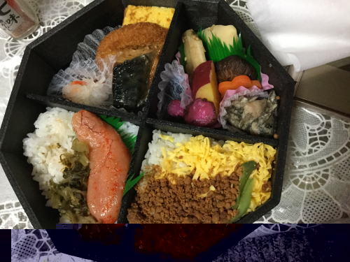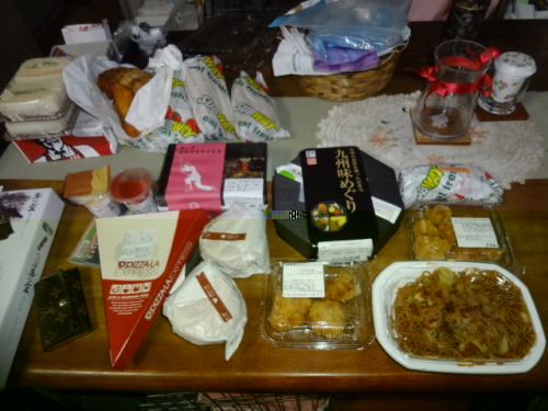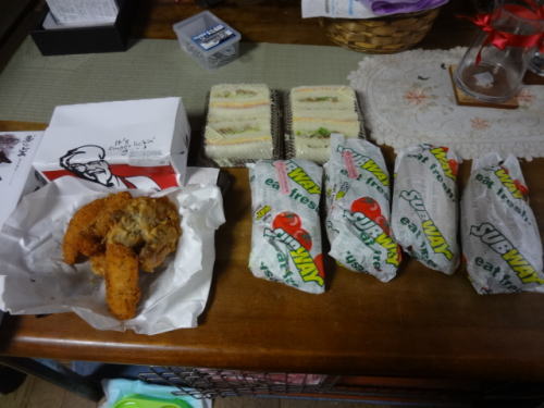 | ケンタッキーフライドチキン1000円2個、モスバーガー4個、サンドイッチ2個 | 焼きそば、から揚げ2個、モスバーガー2個、ピザ1個、弁当1500円2個、プリン2個、 ホットドック1個、そのほかMrドーナッツ3個、フライドチキン2個などもあり |