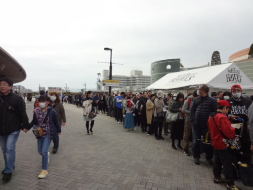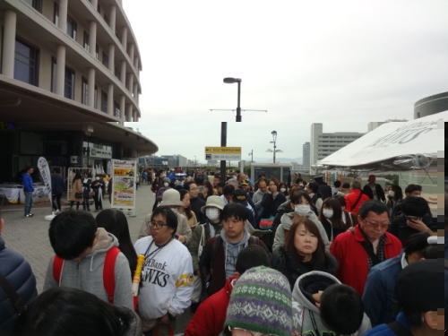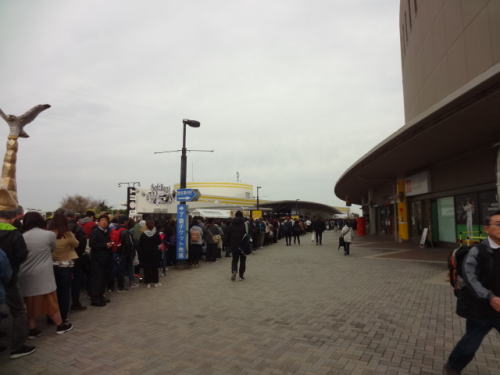 | 9時30分ごろには6列で8番ゲートから6番ゲートまで並んでいる | 私たちの後ろにもたくさんの人が | |