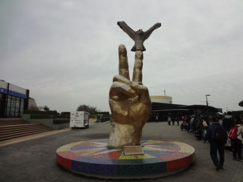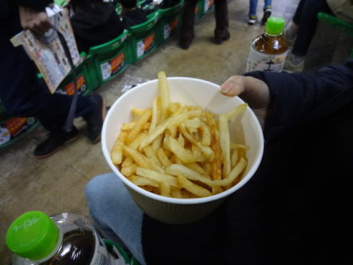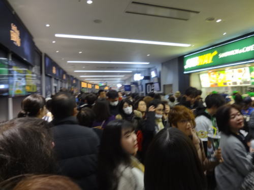 | ベンチでポテトフライを。ポテトフライ前にはケンタッキー500円、エビアボガド260円食す | 11:30分頃の一般入場者がが入った通路、人がいっぱいで歩くにも困難 | |
