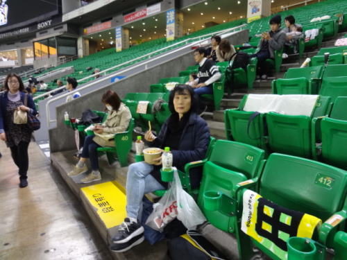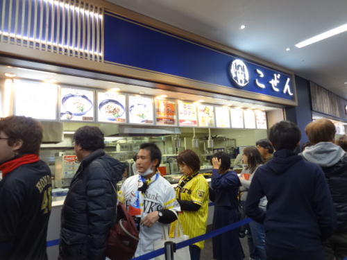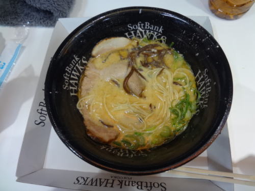 | 豚骨ラーメン通常800円、味はまずくないけれど半額セールでなければ買うこともない | 開始直前の13:00頃、一塁側は外野から内野席まで超満員 | |
