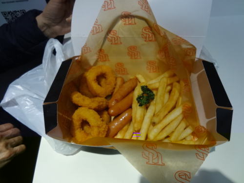 | フライ盛り1000円→500円 イカとソーセージとポテト、500円でも2度と買わない | RKBラジオでおなじみタレントの加藤 淳也さんがドーム内をリポートしていました | |