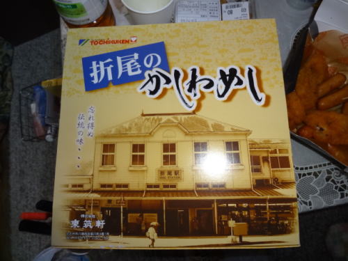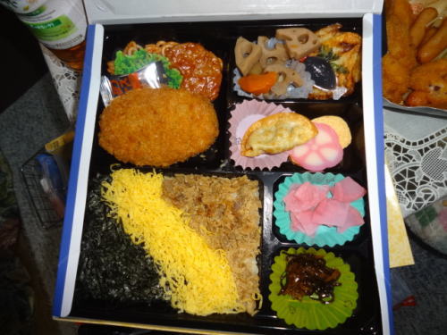 | お土産として半額で折尾のかしわめしを買ってきました | かしわめしとしてそぼろ、錦糸卵、のりの三色ご飯にコロッケ、ハンバーグなどがあり | |