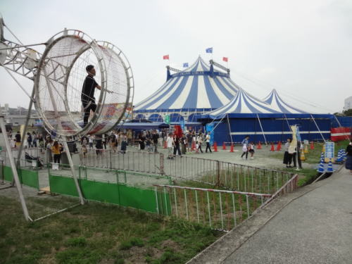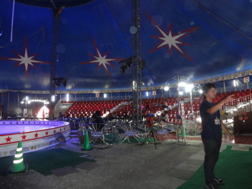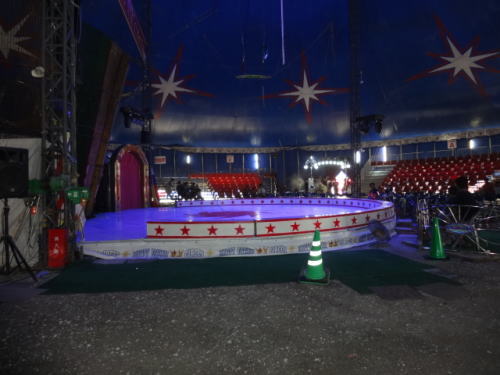 | 会場前にはサーカスの演目の一つにあった大車輪が設置10分500円 | 開演前のステージ、私たちは自由席だったので横方向からみることに | |
