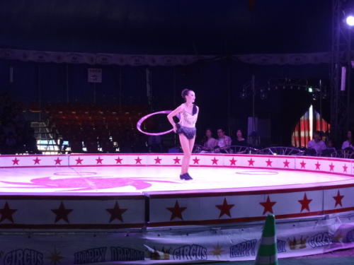 フラフープの演技で30本ほどのフラフープを回したり、 手を使わず足元に転がっているフラフープを頭の上まで上げていく |
