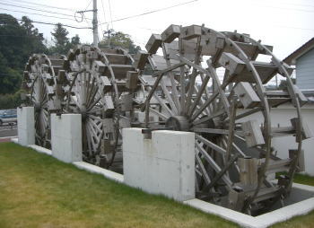 | 朝倉農産物販売所 ”三連水車の里あさくら” | 三連水車の里あさくらの傍にある三連水車レプリカ |