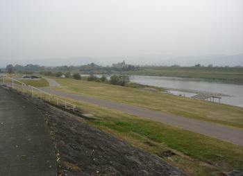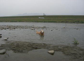 | 原鶴温泉からみた筑後川 | 愛犬ポチは11月というのに水の中へ |