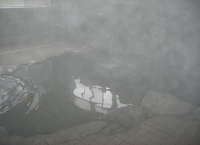 | 岩戸温泉浴室 温泉の名前にふさわしいような岩で築かれた浴槽 残念ながら湯気でぼやけてしまった |