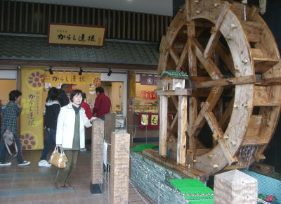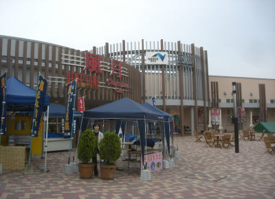 霧島温泉中心部の温泉市場? 足湯が設けられており、温泉たまご、お土産なども売られている |