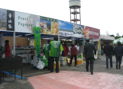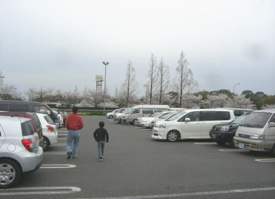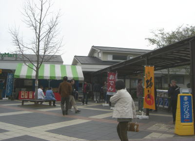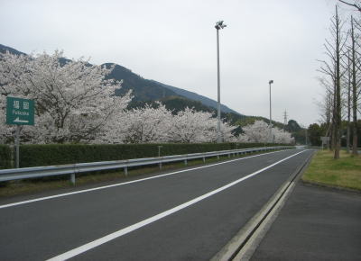 | 霧島温泉からの帰り道の宮原サービスエリア。九州うまかもん市が開催され、野菜類や地鶏の炭火焼きなどが売られていた。 | 宮原サービスエリア内の桜。満開であった |