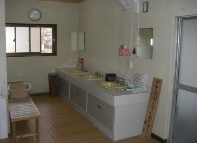 民営国民宿舎霧島みやま荘の更衣室。浴槽には他のお客さんがいるため写すことができないため、やむをえず更衣室を撮影。 |