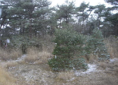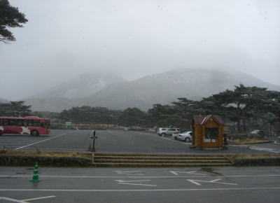 | 霧島温泉からえびの高原へ行く途中、3月28日というのに雪が降りはじめうっすらと雪化粧がみられた | えびの高原駐車場 雪が舞っている。 |