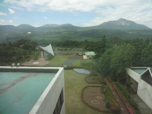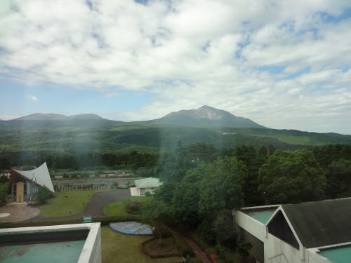 | 霧島ロイヤルホテル4階からの眺望、遠くには霧島連山が | 眼下に見えているのは結婚式会場で、白い屋根の建物は結婚式用のチャペル。 | |