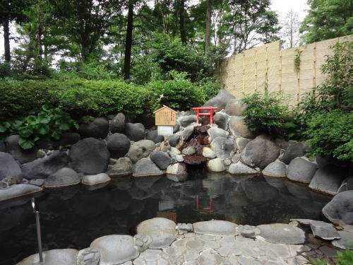 | 大浴場 泉質は単純泉、少し熱めでした。 | 露天風呂にはほてるが霧島神社のそばにあるということで小さな鳥居が飾ってありました | |