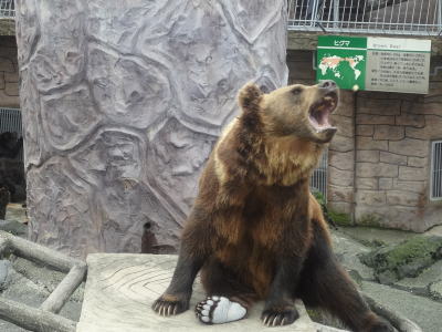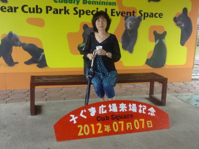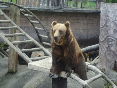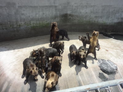 | 熊ゾーン記念撮影場所にて | 食べ物をねだっているところで、頭がいいのか二本足だけで立ち、こっち、こっちと手招きし餌の誘いをかける | |