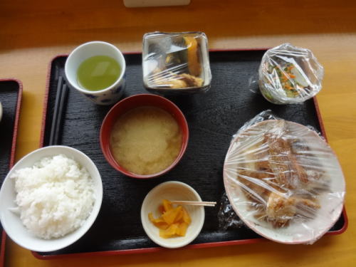 | 宇土マリーナでの昼食。ここでは好きなものを選んで食事ができる。メニューはあら煮 かぼちゃと酢もので料金は650円程。 |