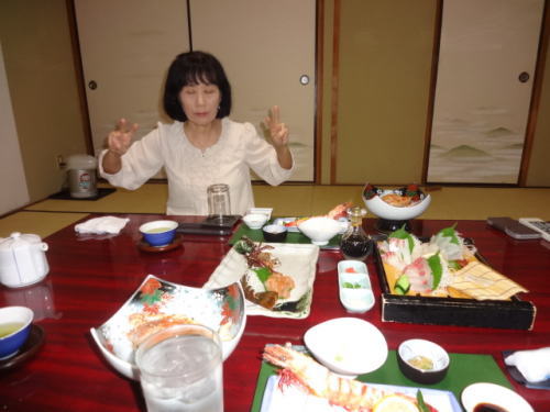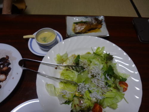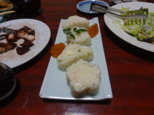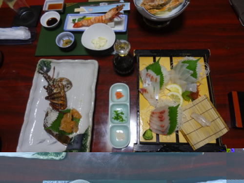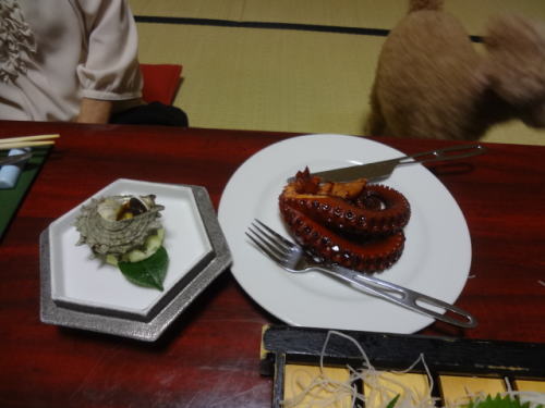 | 料理は宿の自慢だけあってとても美味しかった | サザエとタコステーキ。お腹いっぱいでタコは少し残しました | |