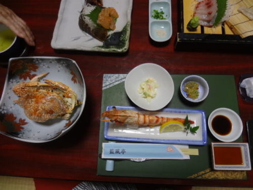 | 前菜として4種類ほどの刺身とウニ、イセエビの刺身など | ワタリカニと車エビ。両方ともおいしかったけどワタリガニは最高においしかった | |