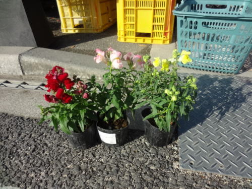 | 宇城道の駅、開店10分ほど前についたためお花を物色中 | 購入したお花、1個60円で合計180円 | |||||