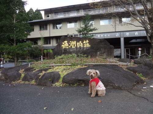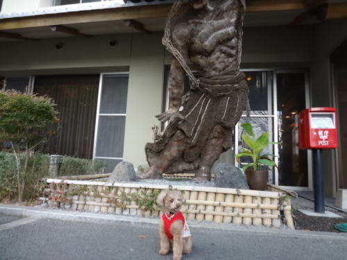 | 通儒運山荘正面でトイ君の記念撮影 | 通潤山荘玄関わきの仁王様の前で | |||||