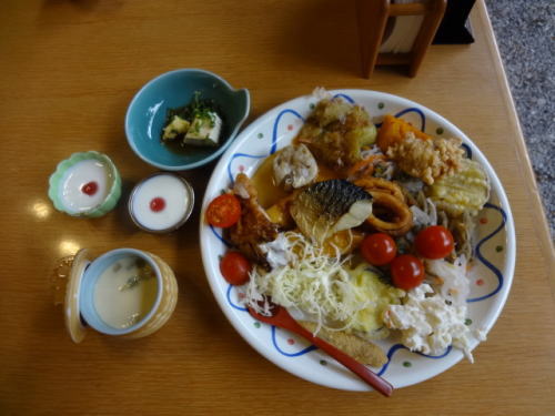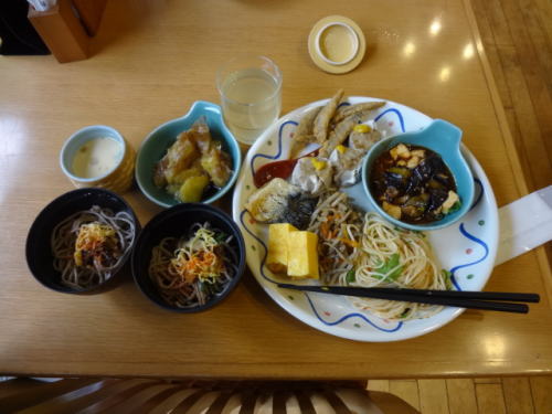 | バイキンク、そばとスパゲティ、マーボ豆腐、サバ塩焼き、ワカサギ天ぷらなど゙ | トマトサラダ、イカ天ぷら、焼きナス、きんぴらごぼう、茶碗蒸し、杏仁豆腐など | |