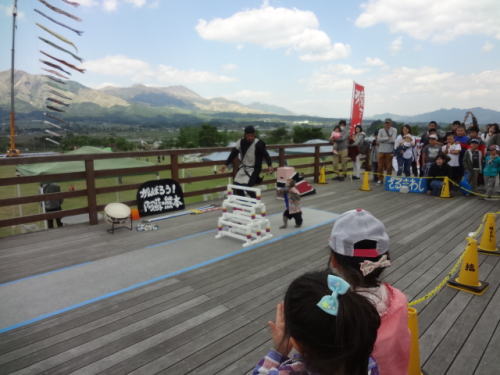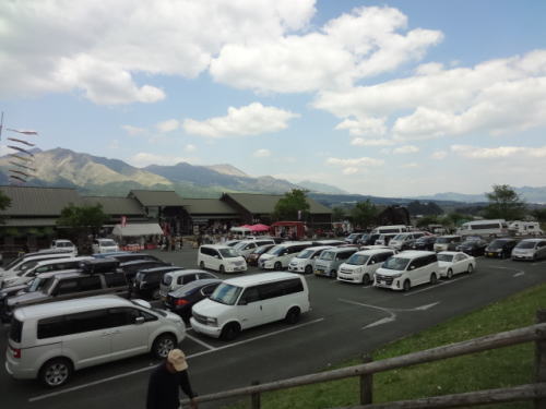 | 道の駅「あそ望の郷くぎの」は人気が高く、駐車場は満杯で駐車スペースを探すのに苦労。 | 「あそ望の郷くぎの」は道の駅としてお店もたくさんあり魅力のある道の駅である。 今回は広場で猿回しも行っており多くの人でにぎわっていた。 |