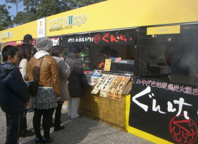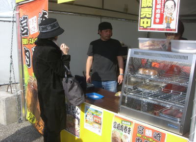 | 宮崎地鶏炭火焼き ぐんけい 1パック500円と1000円がある | 宮崎名物肉巻きおにぎり。1個300円。行列がすごい |