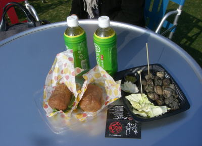 | 芝生広場には休憩兼食事場所が設けられている | 宮崎地頭鶏の炭火焼と肉巻きおにぎりを食べてみました。 |