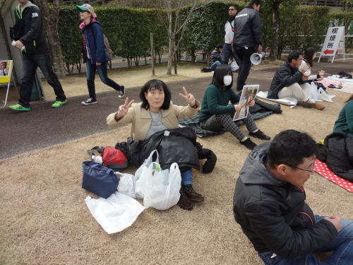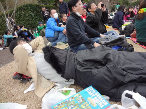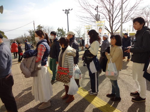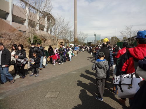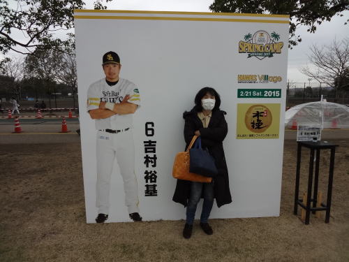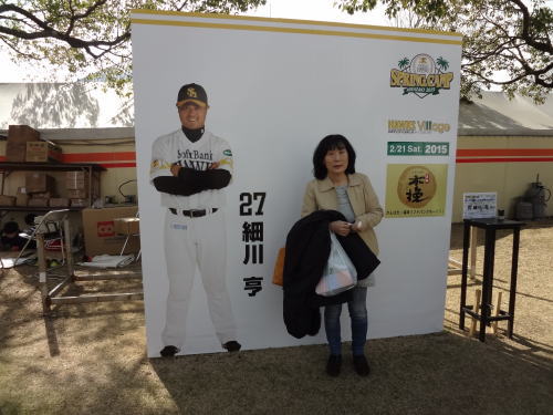 | 旦那の大好きな吉村選手のパネル前で記念撮影 | オリックスとのオープン戦外野席に入場するための行列。ちなみに入場料は1000円 | |