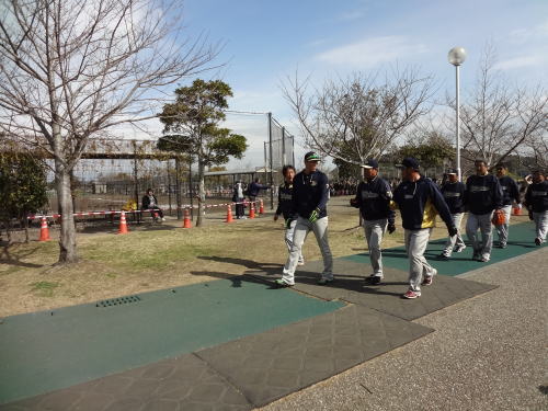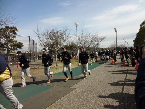 | オリックス選手 多目的グランドからスタジアム方面へ移動 | オリックス選手 前列左の選手は糸井選手 | |