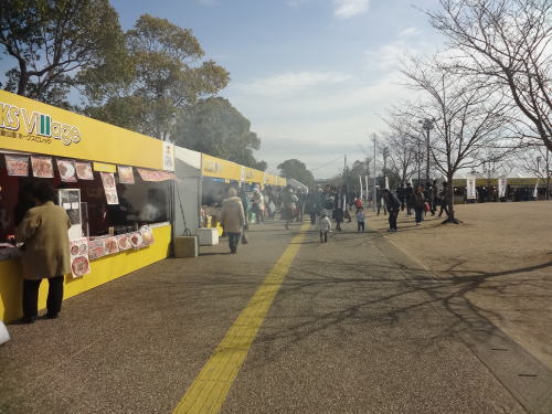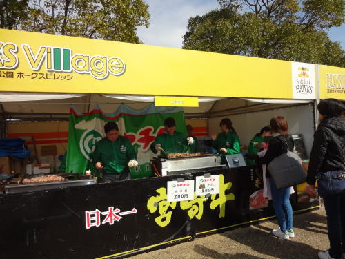 | キャンプ名物グルメ通り。 白い煙が出ているところは地鶏炭火焼店 | ”ミヤチク”の産黒毛和牛サイコロステーキ販売店 | |