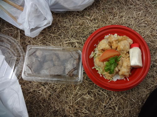 | ”ミヤチク”の産黒毛和牛サイコロステーキを購入するために並ぶ | 左が)サイコロステーキ(500円)、右が鳥南蛮丼(400円) | |