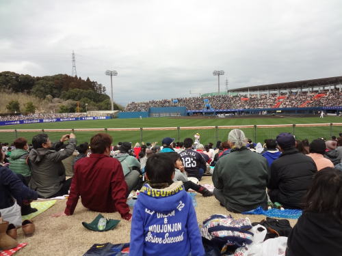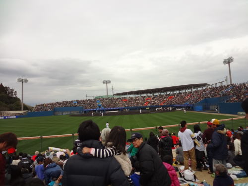 | レフト側外野席で観戦。天気も良く絶好の観戦日和でした | 試合前の練習中。 観客は外野席も内野席もほぼ満員状態 | |