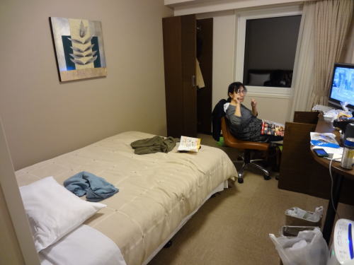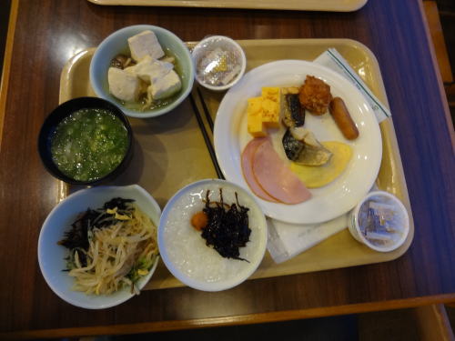 | ルートイングランティアあおしま太陽閣 部屋はセミダブルながら感じよし | ルートインホテル朝食。バイキング形式でおかゆなどをチョイス | |