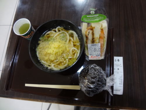 | 宮原サービスエリアにて休憩 時間は自宅を出て2時間後のAm9:00 | 宮原サービスエリアにて朝食 メニューはカツサンドと素うどん、自宅より持参の梅入り爆弾おにぎり | |