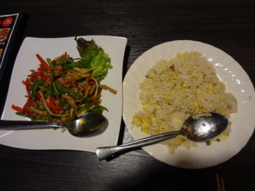 | 昼食は小林市の中国屋台金洋で、駐車場は狭いが店内は個室ぞろいで雰囲気良 | チンジャオロース(900円)、チャーハン(700円)を2人で分けていただきました | |