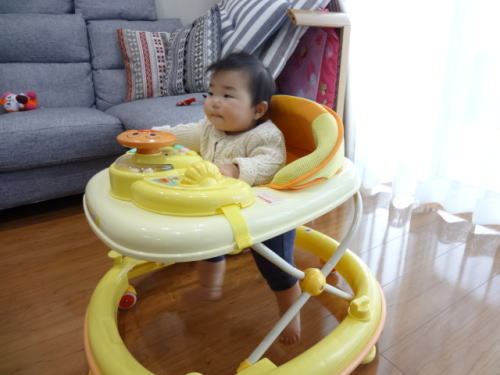 | 7か月目の愛花ちゃん。元気いっぱいで歩行器もうまく操っています。 | 心花ちゃんはおばあちゃんが大好きでいつも抱っこされています | |