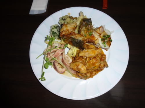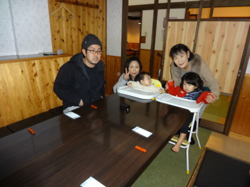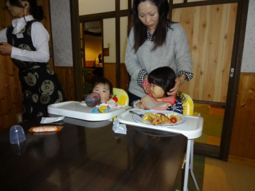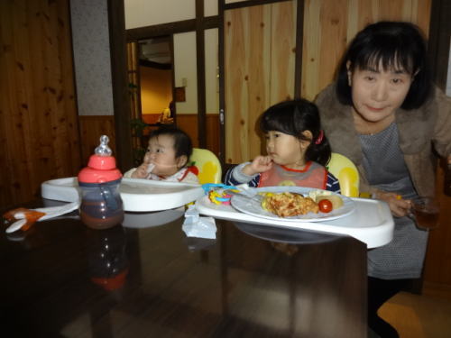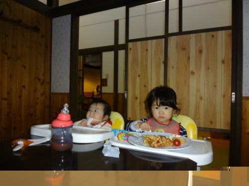 | サバやイカ、天ぷらなど。他には鍋物や刺身などもあるが全体的に質素 | 心花ちゃんと愛花ちゃんも一緒にバイキングをいただきました | |