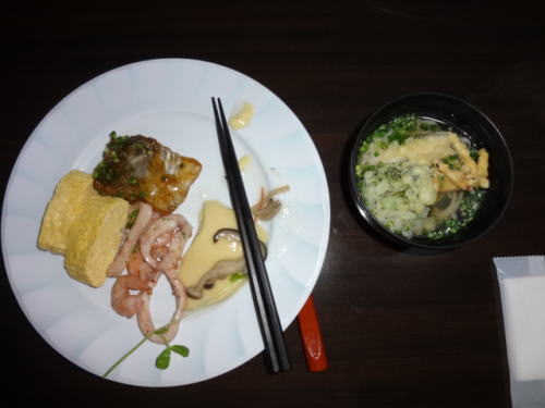 | 食事会場個室を用意していただいてました | バイキング形式の夕食で写真は卵焼き、サバ、イカ、そばなど | |
