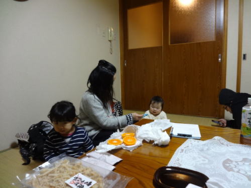 | みんな部屋に戻ってくつろいでいます | 心花ちゃんはミカンが大好きで愛花ちゃんにもあげようとしています | |