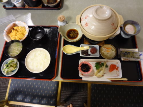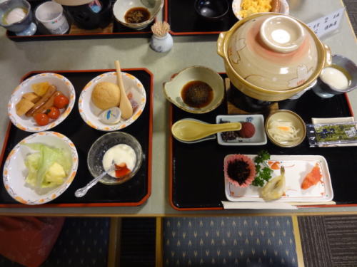 | 朝食 和食でおかゆと卵オムレツ、キスの揚げ物、明太子湯豆腐などがあります | 和食と洋食で右側の湯豆腐などは全員同じですが左側はバイキング形式。パンやフルーツなど | |