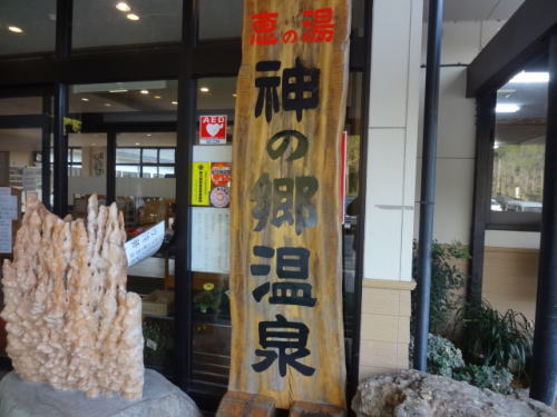 | 宿泊は小林市にある神の郷温泉。4か月ほど前に予約していました | 神の郷温泉玄関付近。日帰り入浴やバイキング食事の客が多くたいへんこんでいました。 | |
